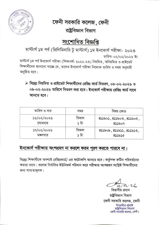 সংশোধিত বিজ্ঞপ্তি ইনকোর্স পরীক্ষা-২০২৩ প্রিলিমিনারী টু মাস্টার্স রাষ্ট্রবিজ্ঞান বিভাগ ফেনী সরকারি কলেজ। Download